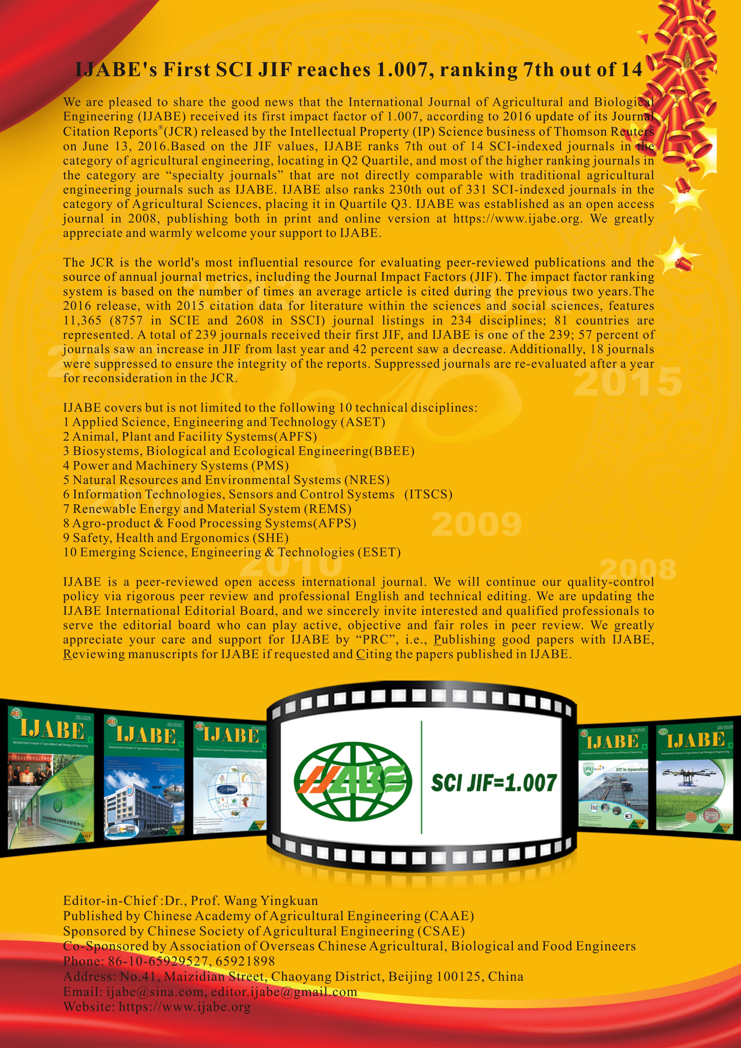 IJABE’s First SCI JIF reaches 1.007, ranking 7th out of 14